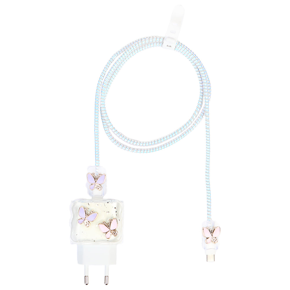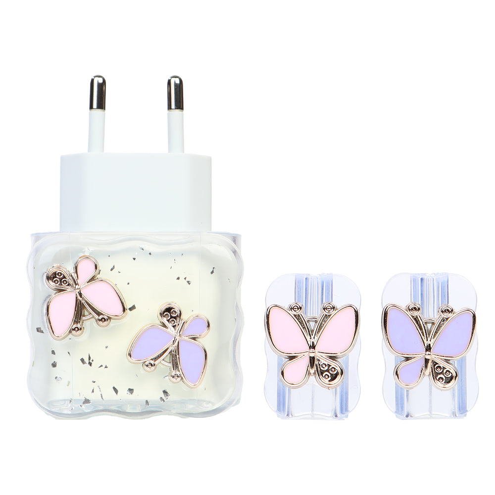 Şarj Başlığı ve Kablo Koruyucu 4 lü Set Mor Pembe Kelebek